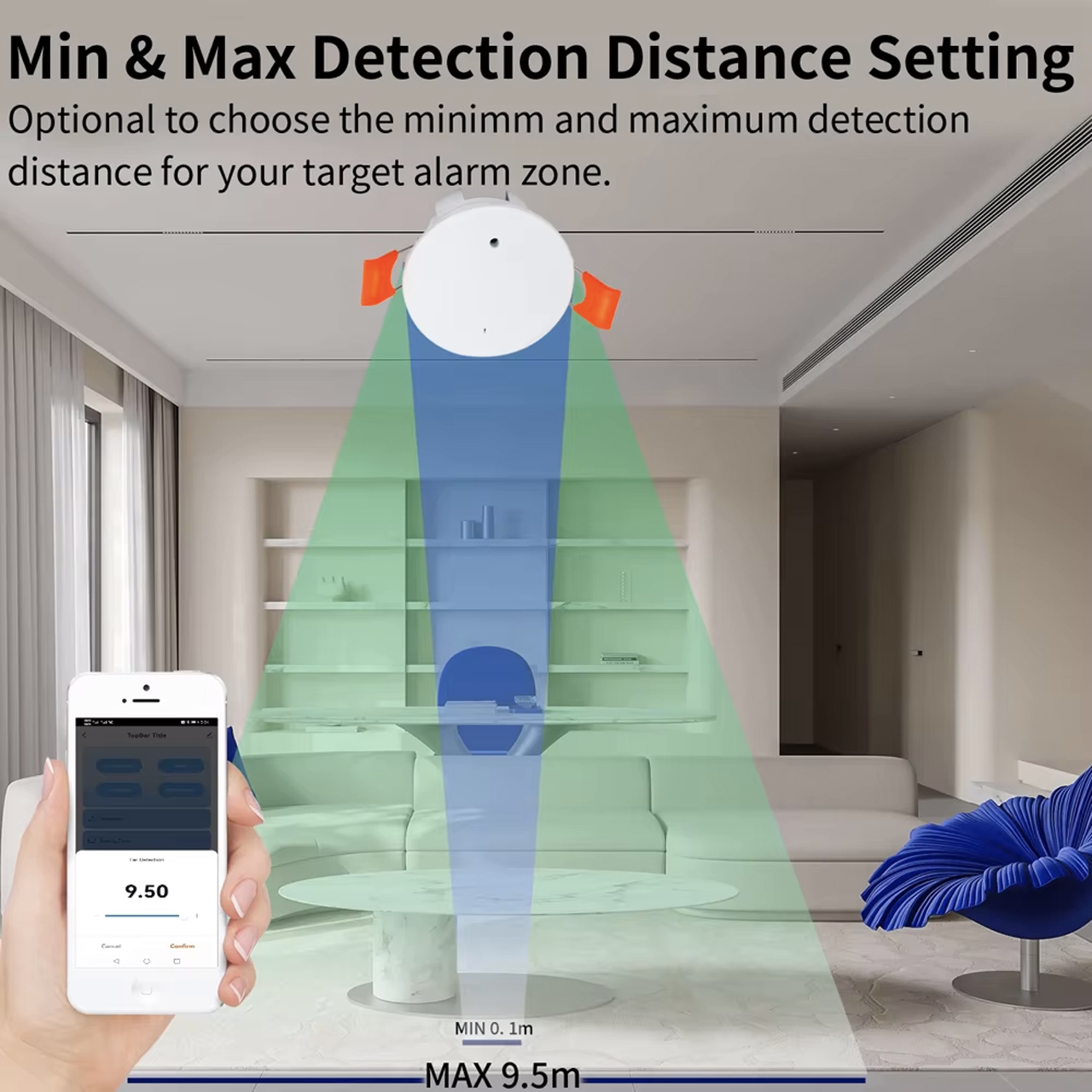 • Расстояние обнаружения: 0,3-9 м (по умолчанию 6 м)